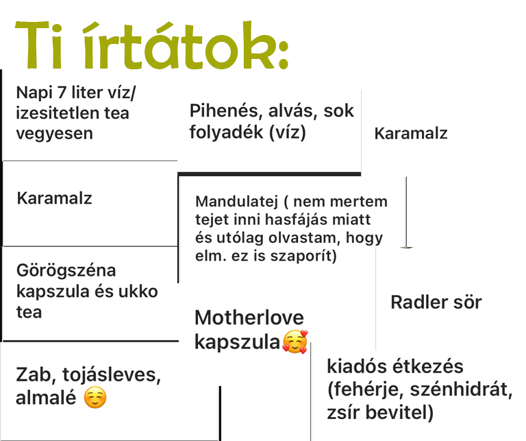 Nagyon fontos, hogy rendszeresen, változatosan egyél, minél táplálóbb ételeket. Szénhidrátban, fehérjében gazdag étrendet kövess. Kérj segítséget a családtól és a barátoktól, biztosan szívesen visznek 1-1 adag főtt ételt. Van, aki esküszik a zab és a zabkása anyatej növelő hatására. Sokan a cukros, rostos üdítőktől tapasztalnak mennyiségi növekedést és van akinek a Karamalz maláta sör válik be. Fontos a megfelelő folyadék bevitel, próbálj meg naponta 3-4 litert inni. A szoptatós teákra általánosságban igaz, hogy érdemes napi 1,5 litert fogyasztani belőlük.